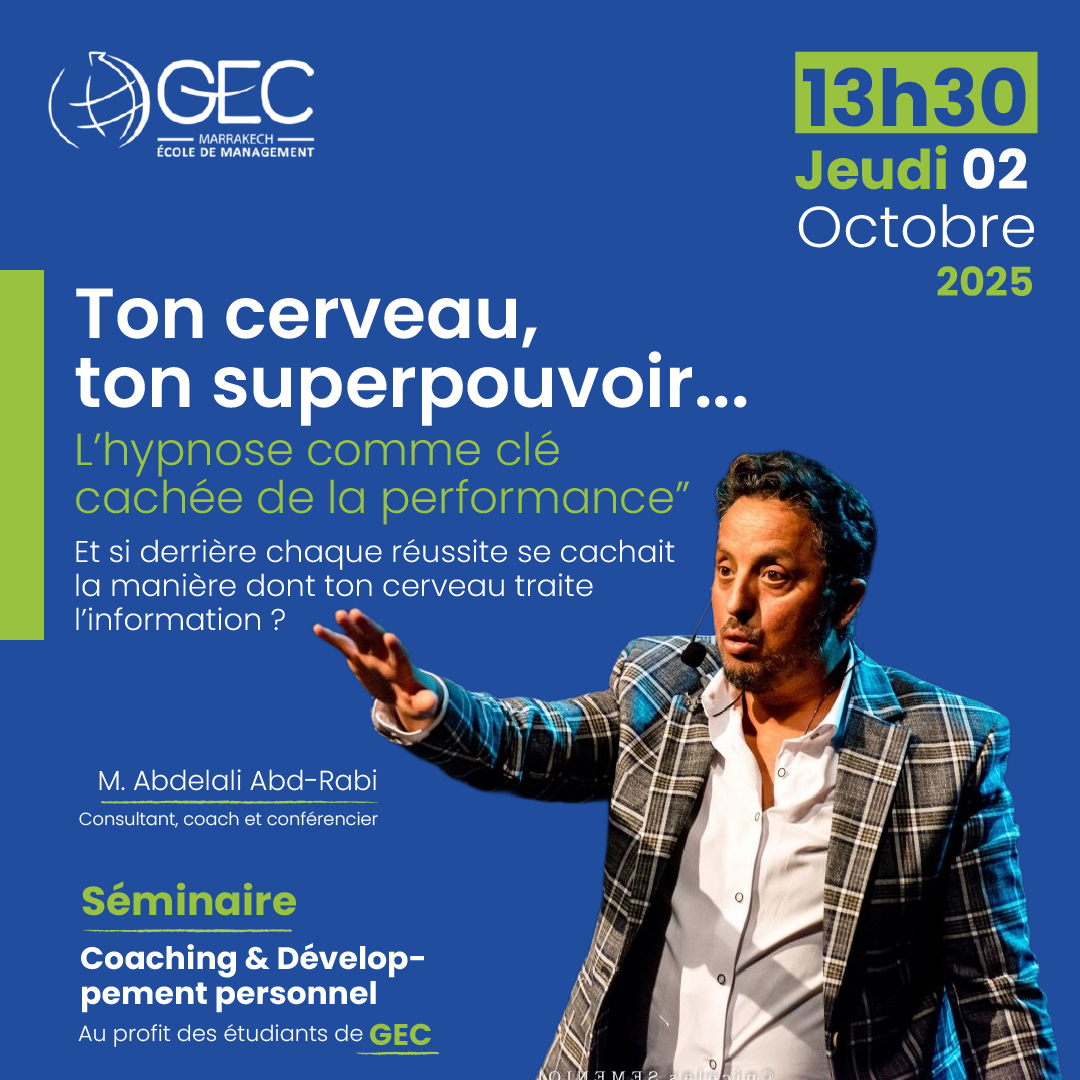 « Et si derrière chaque 𝐫é𝐮𝐬𝐬𝐢𝐭𝐞 se cachait la manière dont ton 𝐜𝐞𝐫𝐯𝐞𝐚𝐮 traite l’information ? 𝐋’𝐡𝐲𝐩𝐧𝐨𝐬𝐞 et les 𝐧𝐞𝐮𝐫𝐨𝐬𝐜𝐢𝐞𝐧𝐜𝐞𝐬 révèlent des leviers insoupçonnés pour mieux apprendre, renforcer la concentration et libérer la créativité. Une exploration interactive pour découvrir comment exploiter pleinement le potentiel de ton esprit. » GEC Marrakech – École de Management a le plaisir d’inviter ses étudiants au séminaire «Ton cerveau, ton superpouvoir… 𝐋’𝐡𝐲𝐩𝐧𝐨𝐬𝐞 comme clé cachée de la performance», animé par M. 𝐀𝐛𝐝𝐞𝐥𝐚𝐥𝐢 𝐀𝐛𝐝-𝐑𝐚𝐛𝐢, Consultant, Coach et Conférencier de renom (France). Jeudi 02 octobre 2025 13h30 𝐂𝐚𝐦𝐩𝐮𝐬 𝐝𝐞 𝐆𝐄𝐂 𝐌𝐚𝐫𝐫𝐚𝐤𝐞𝐜𝐡-É𝐜𝐨𝐥𝐞 𝐝𝐞 𝐌𝐚𝐧𝐚𝐠𝐞𝐦𝐞𝐧𝐭 : 𝐐𝐮𝐚𝐫𝐭𝐢𝐞𝐫 𝐈𝐳𝐝𝐢𝐡𝐚𝐫 à 𝐌𝐚𝐫𝐫𝐚𝐤𝐞𝐜𝐡 Un rendez-vous inspirant pour plonger au cœur du développement…